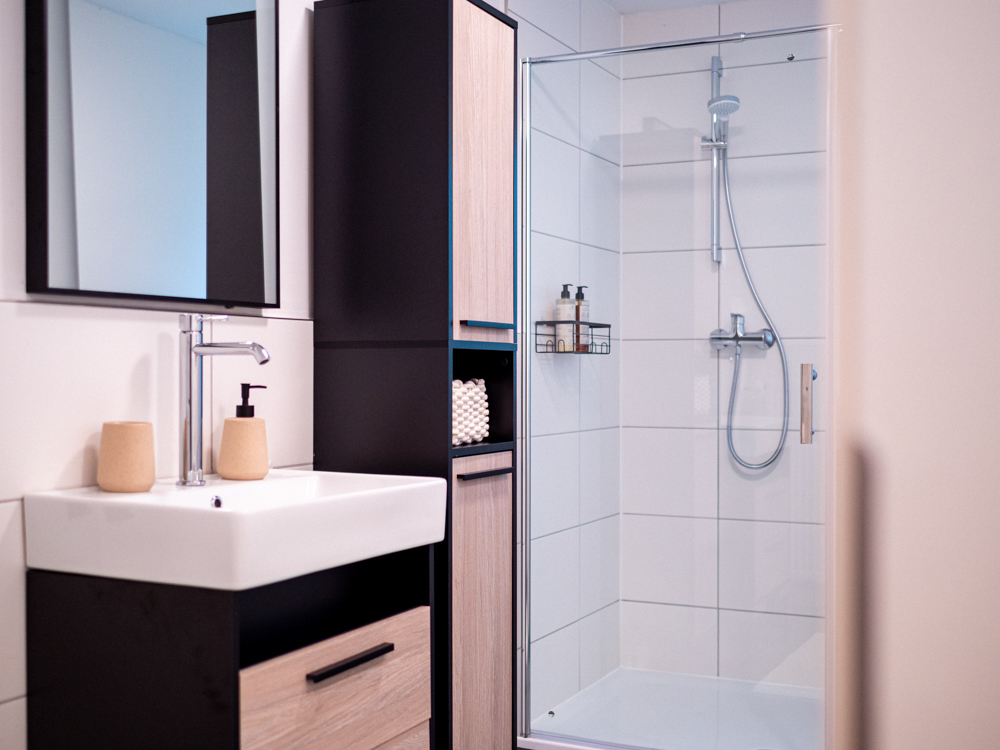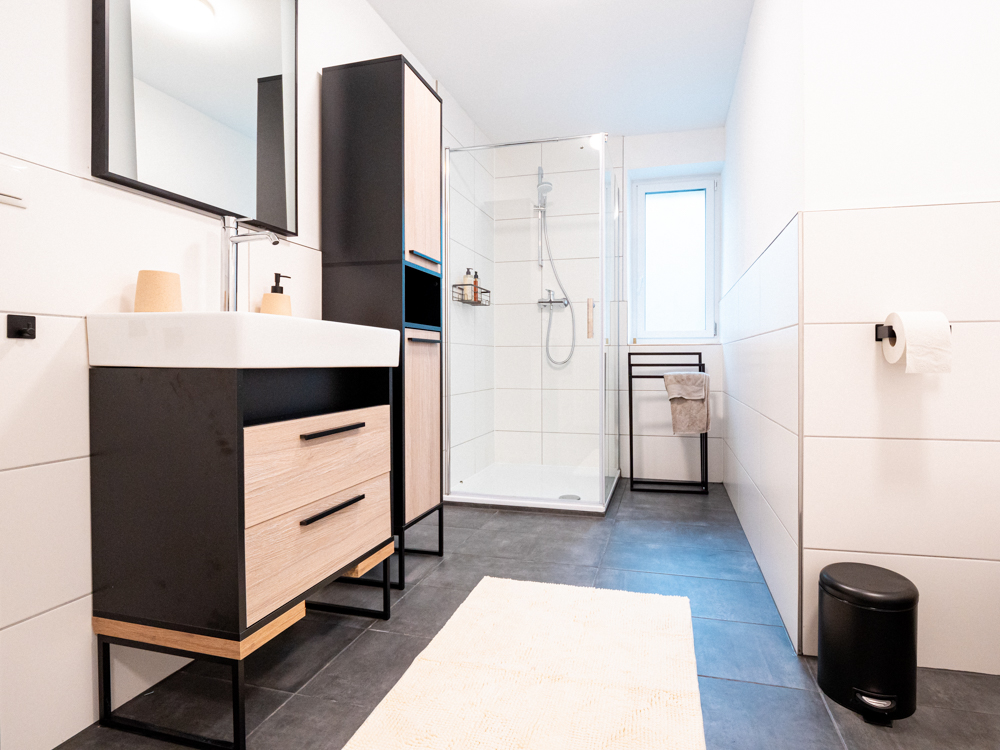 Badezimmer: 1 modernes Bad mit großer Dusche.