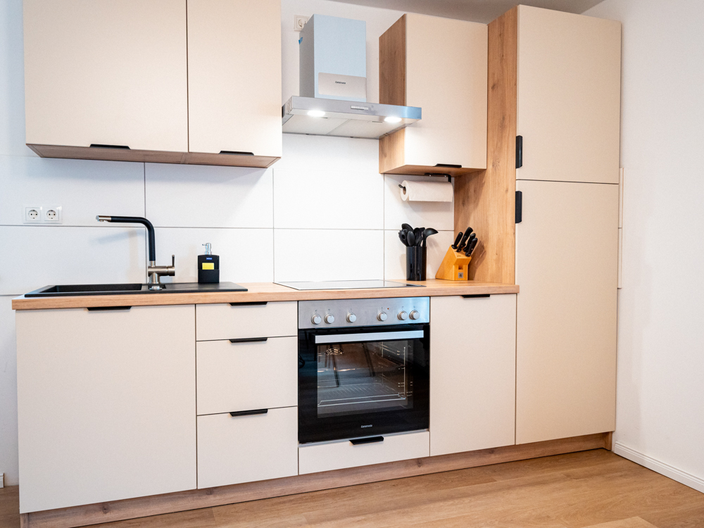 Voll ausgestattete Küche: Herd, Backofen, Kühlschrank, Mikrowelle.