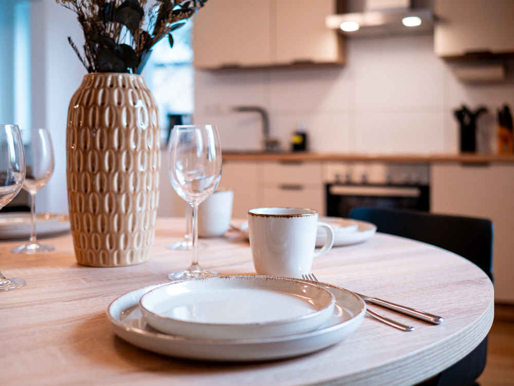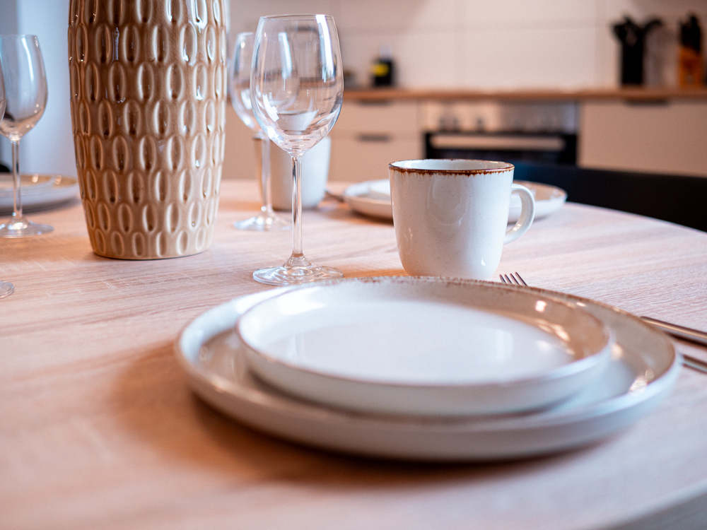Geschirr, Besteck, Töpfe, Pfannen und Grundausstattung für Selbstverpflegung.