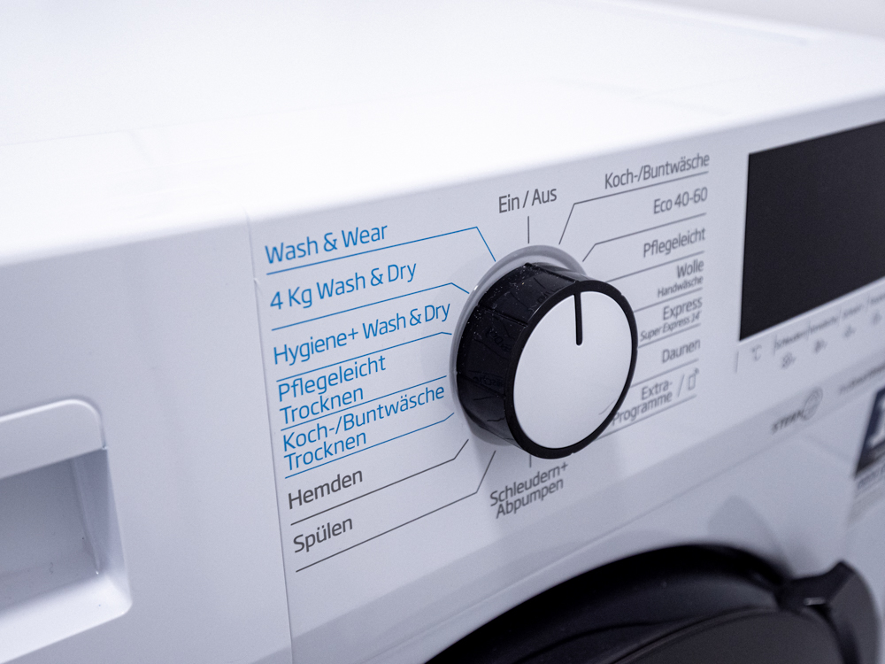 Premium-Waschtrockner in der Wohnung, Bügelbrett & Bügeleisen.