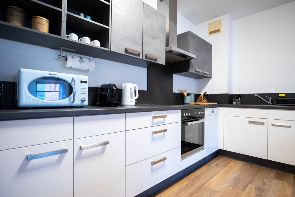 Praktische Annehmlichkeiten wie ein Bosch Premium Waschtrockner, Bügelbrett und Bügeleisen sowie hochwertige Bettwäsche und frische Handtücher machen auch längere Aufenthalte komfortabel. Ein kleines Welcome-Set mit Kaffee/Tee sowie Duschgel und Shampoo sorgt dafür, dass Sie sofort ankommen können. Kostenfreie Parkplätze rund um das Gebäude erleichtern die Anreise mit dem Auto.