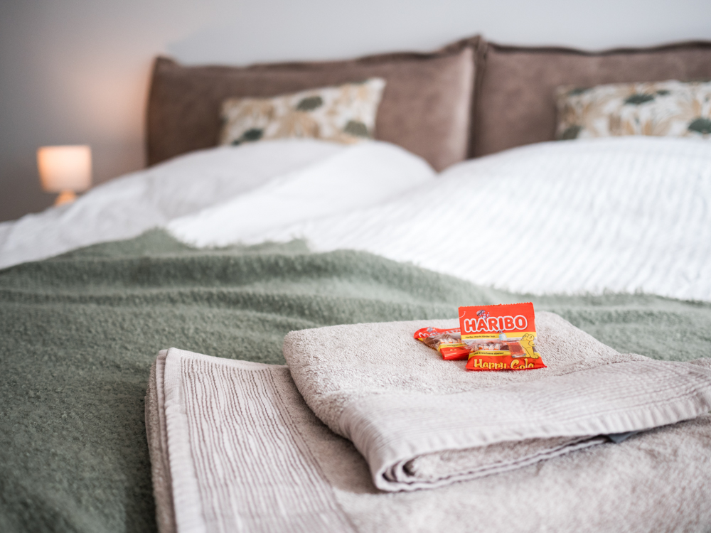 Premium-Bettwäsche, Willkommens-Care-Set (Kaffee/Tee) und hochwertige Handtücher.