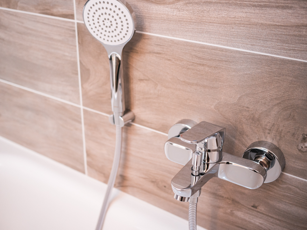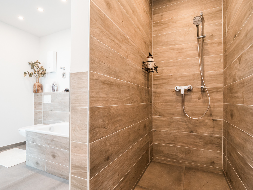 Badezimmer: 1 Bad mit großer Dusche und Badewanne; frische Handtücher & Pflege-Set.