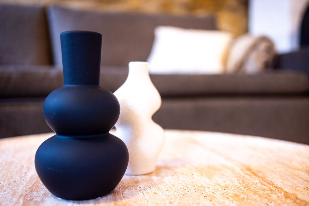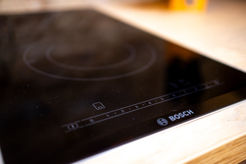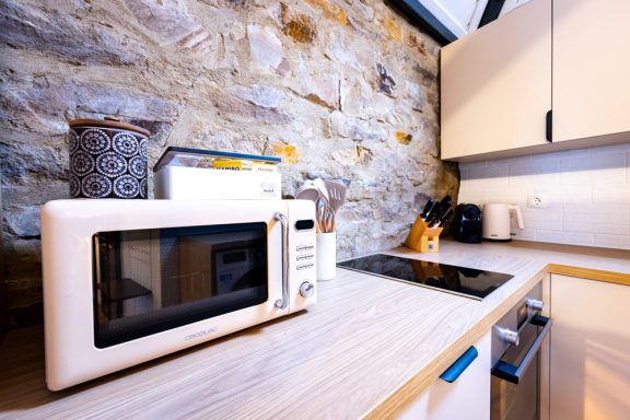 Der offene Wohnbereich ist auf Komfort ausgelegt: Ein 55” Smart-TV (mit Netflix & Disney+) sorgt für gemütliche Abende, während das schnelle WLAN Streaming und Arbeiten gleichermaßen unkompliziert macht. Die voll ausgestattete Küche inklusive Nespresso-Kaffeemaschine ermöglicht Selbstversorgung auf hohem Niveau — ob schneller Espresso am Morgen oder ein gemeinsames Abendessen nach einer Weinprobe. Zusätzlich steht ein Premium-Waschtrockner bereit, was längere Aufenthalte praktisch und stressfrei macht.
