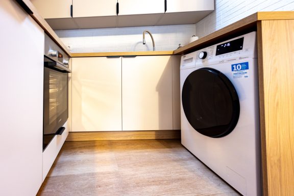 Premium-Waschtrockner (praktisch für längere Aufenthalte).