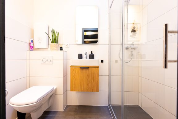 Badezimmer: 1 modernes Badezimmer mit Dusche.