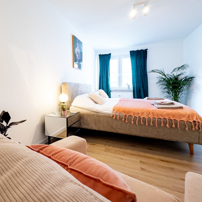 Helles, modern ausgestattetes Apartment für bis zu 6 Personen: 2 Kingsize-Schlafzimmer, Schlafsofa, voll ausgestattete Küche, Premium-Waschtrockner & WLAN.